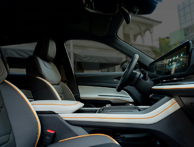 Bên trong cabin, Territory Sport 2025 sử hữu nội thất tông đen chủ đạo với ghế ngồi và khu vực điều khiển trung tâm được tạo điểm nhấn bởi sự kết hợp giữa hai tông màu trắng – cam và họa tiết vân carbon. Các đường chỉ thêu và chi tiết trang trí màu cam xuất hiện khắp không gian cabin, từ ghế ngồi, vô lăng, bệ tỳ tay phía trước tới cửa gió điều hòa hàng ghế sau tạo thêm điểm nhấn cho chiếc xe.